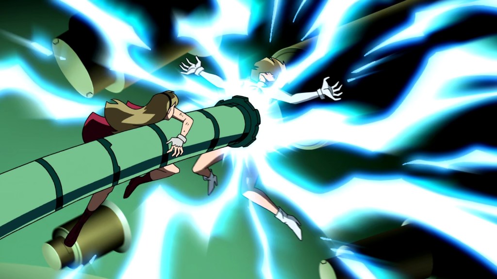 Supergirl takes a real beating from her evil clone but is eventually able to fry her with one of the Watchtower’s massive power cables.