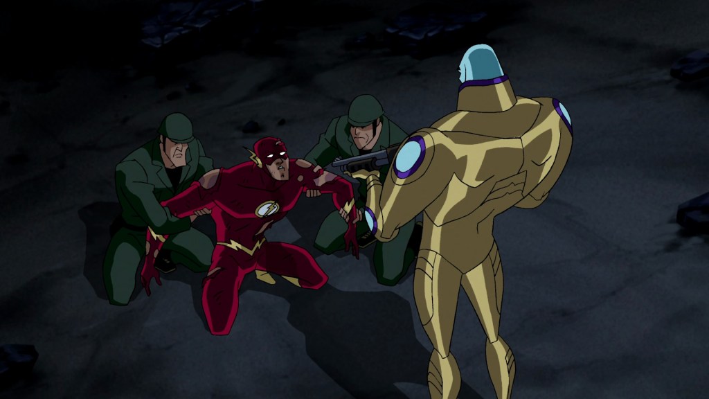 What works better is their dogged determination to play on the key ‘what if?’ moment of Lex killing Flash and then Superman avenging the death, triggering armageddon. ‘Lexiac’ even manifests a shotgun out of thin air and has two drones turn themselves into army men holding Wally down to really drive the concept home. They go to this idea not once, not twice, but three times as the ‘Lex’ drone taunted Superman about murdering him with his eye lasers during the previous fight, and then when Flash seems to perish after his Speed Force moment, the real Lex mocks what just occurred, causing Clark to seize him by the throat in a rage. Is it slightly contrived? Maybe. But Bruce having faith in his friend rising above hate and sparing Lex is a nice moment.