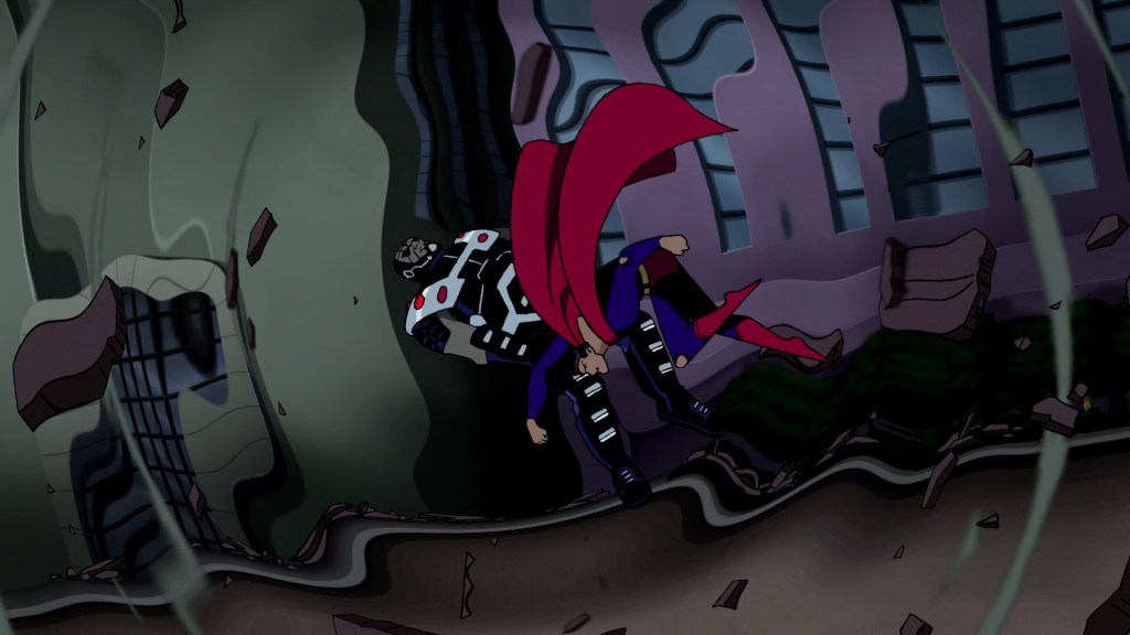 Fundamentally these four get to have quintessential moments that perfectly encapsulate their respective characters. Batman refuses to use a gun in the height of this global invasion with his own stock of gadgets/weapons depleted, becomes the ostensible first person to ever evade the Omega Beams, and KEEPS trying to fight Darkseid with his bare hands. Superman is so inspired by his friend’s determination that he summons the strength required to finally start fully winning the fight with Darkseid, moments after he showed great concern for his nemesis (who he was adamant about not trusting at the start of the episode), trying to protect Lex despite being on his hands and knees at Darkseid’s boot. Darkseid is simply irritated by anybody who isn’t Superman, amused by Batman using elite gymnastics to barely avoid the Omega Beams and then intimidating Lex into fleeing just by pretending he’s going to have to match Bruce’s Herculean effort. He takes every punch Superman can throw and still almost wins. Lex pleads with Metron for help one episode after he laughed in his face, then tries to use reverse-psychology and a fucking gun to threaten a god. Then he insists he’s overqualified when warned “only a twelfth-level intellect” could survive what comes next… and is proven correct! This entire thing culminates in Lex successfully traversing ‘The Source Wall’, discovering The Anti-Life Equation, which Darkseid flocks to like a moth to a flame, showing almost childlike reverence to it as the two villains vanish into the ether and Batman carries Superman to safety. Chef. Fucking. Kiss.
